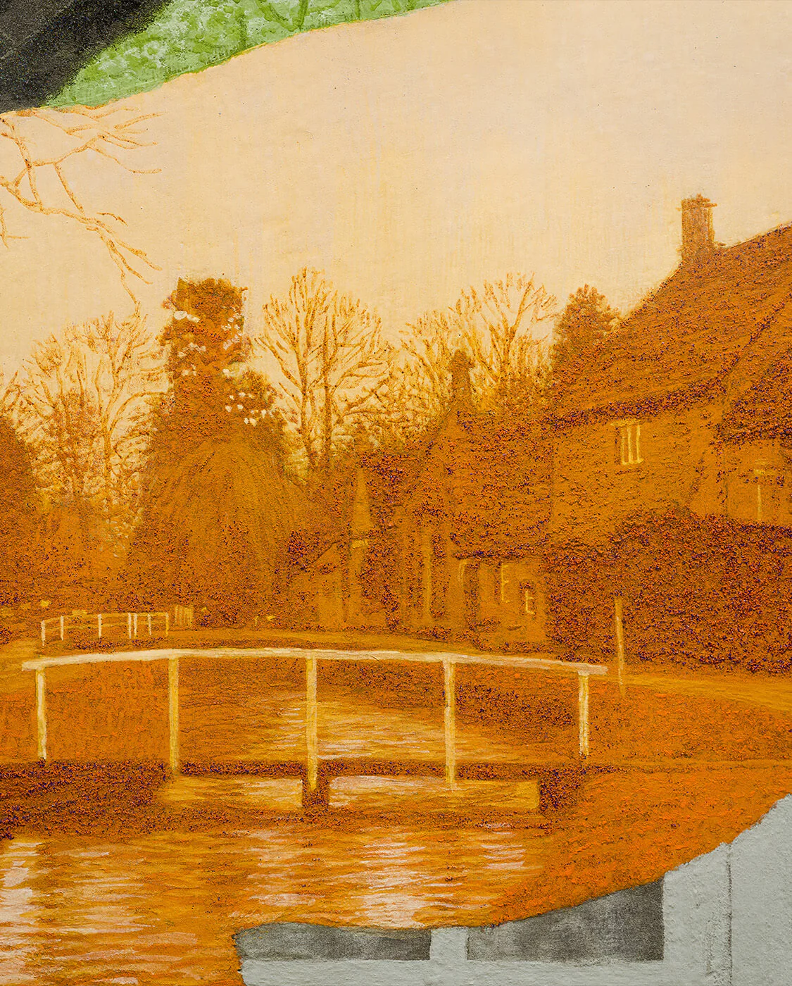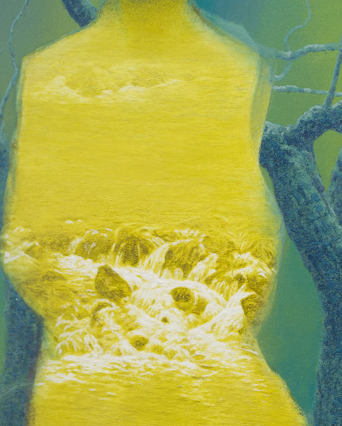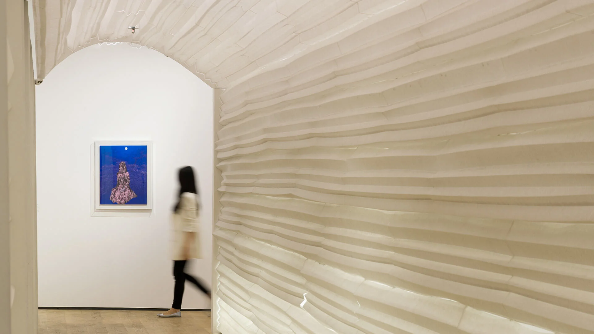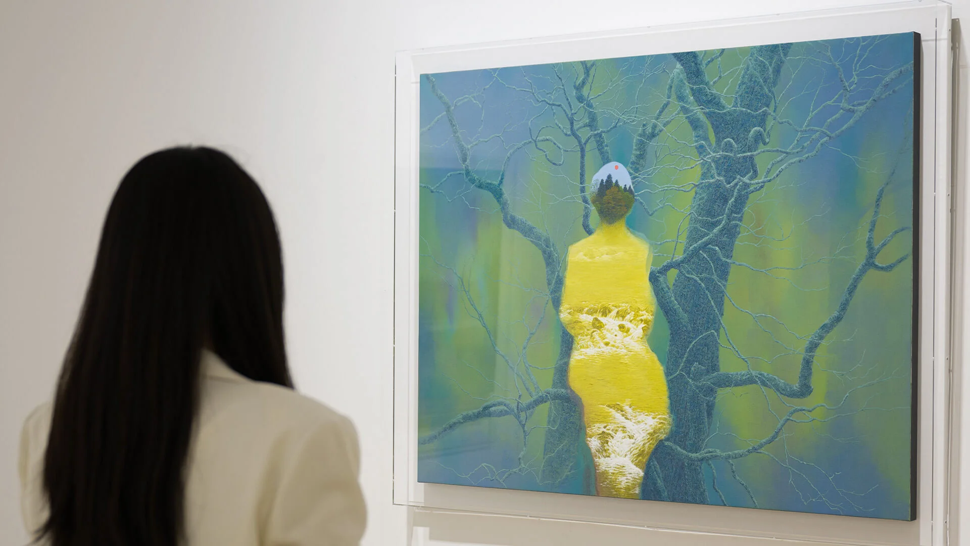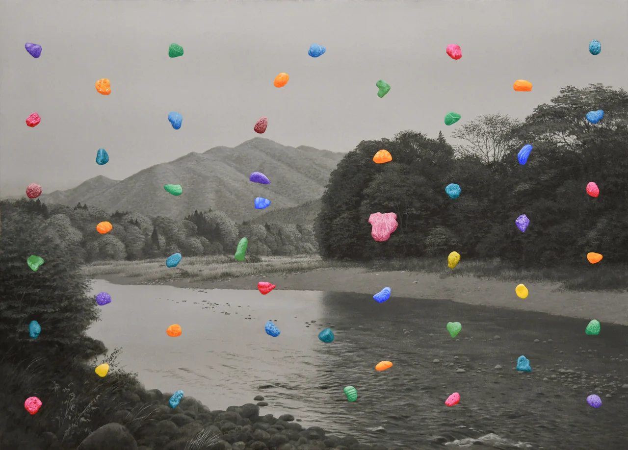 #岩彩 是二川在創作中使用的主要材料。這種塗料被用於傳統日本繪畫,它由研磨成粉粒狀的天然礦石製成,繪畫時混合膠液使用,將顏料黏附在畫紙上,隨著顏料的堆疊變得更加鮮艷和醇厚,營造出獨特的縱深感。二川畫作的色度介於寫實與夢幻之間,像是融合藝術家內心的一片記憶。二川長年與此物料磨合,掌握使用顏料勾畫細節。礦物顏料呈現出鑽石般獨特的色彩和光澤,呈現純粹的風景之美和藝術家對自然的愛戴。